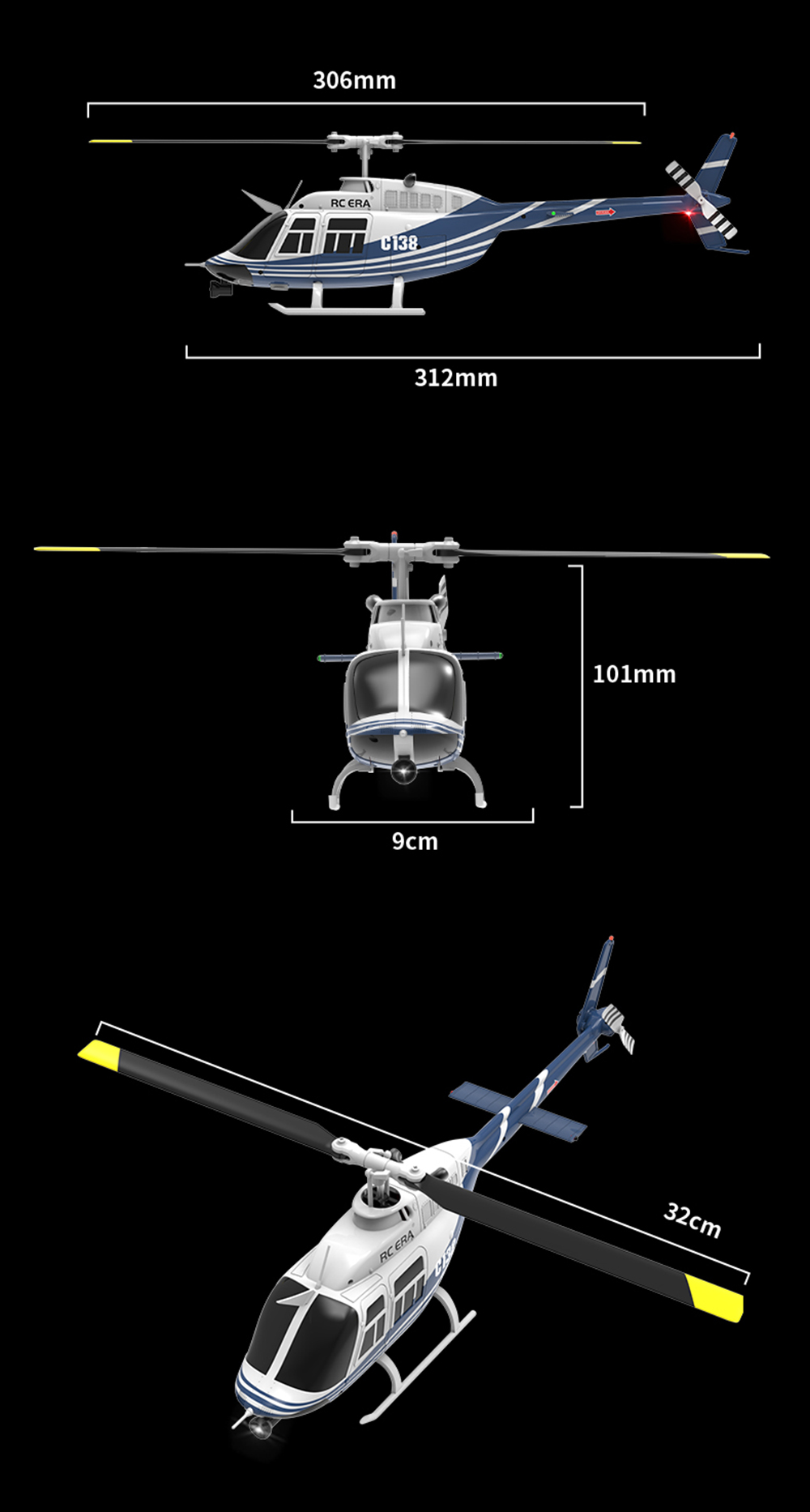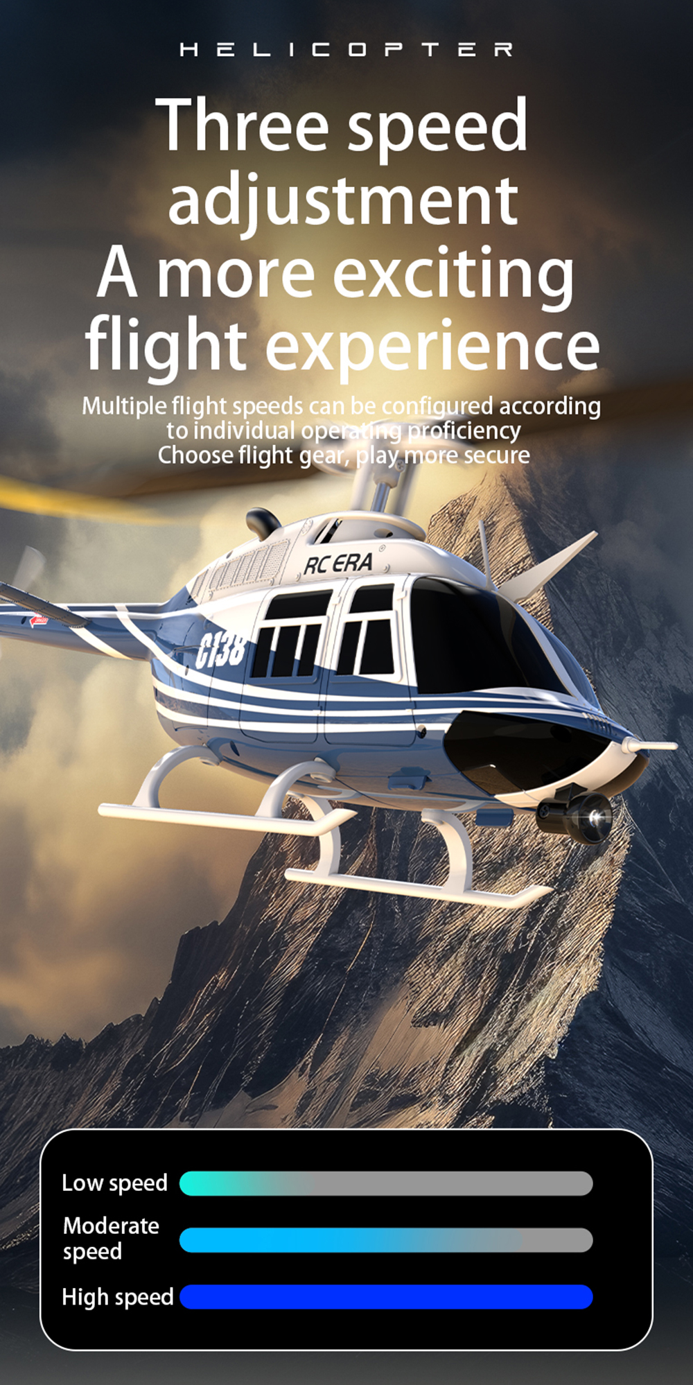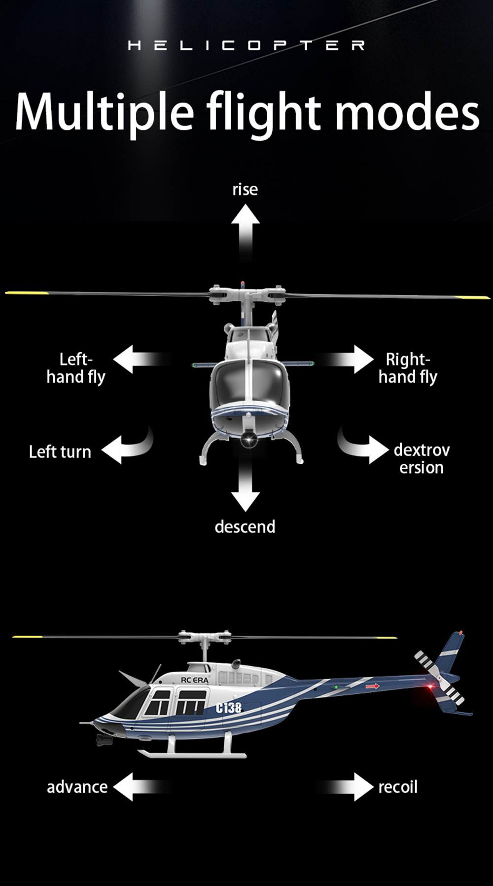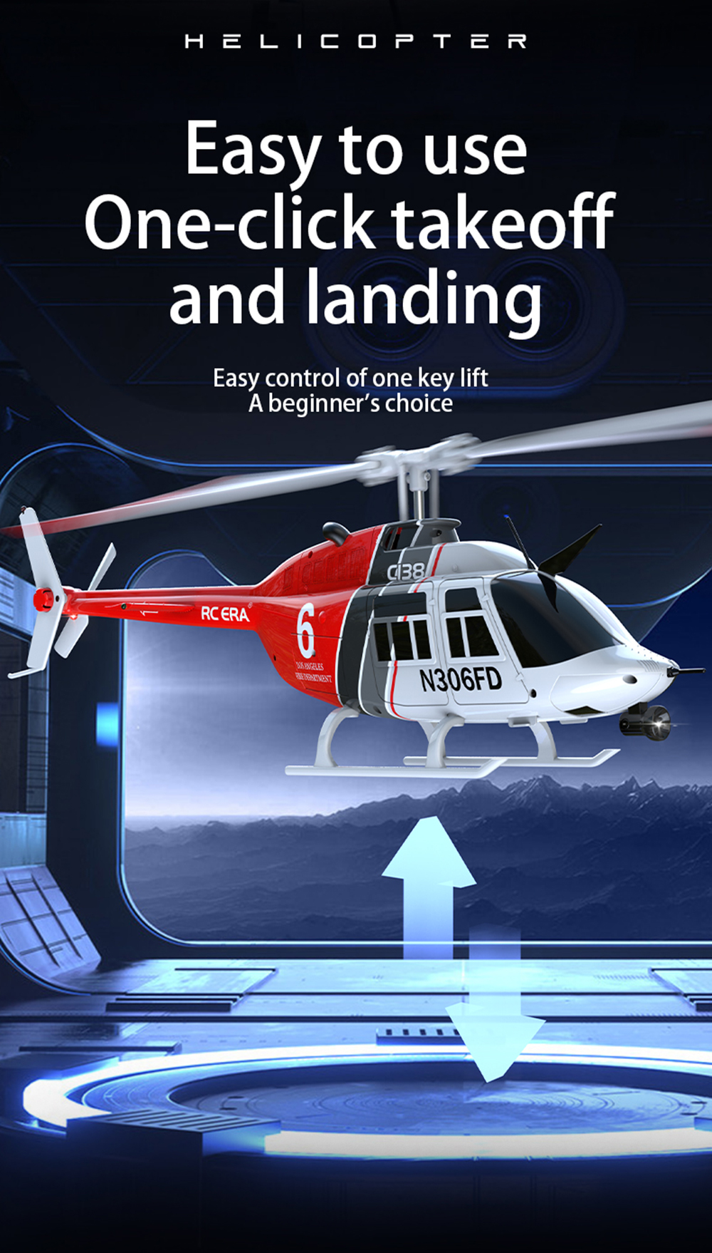 RC ERA OFFICIAL. The RC ERA C138 helicopter, comes equipped with an altitude hold function, enabling steady hovering at desired heights, one-key takeoff for effortless lift-off, and a sophisticated gyro stabilization system ensuring stable flights, perfect for RC hobbyists seeking realistic piloting experiences.